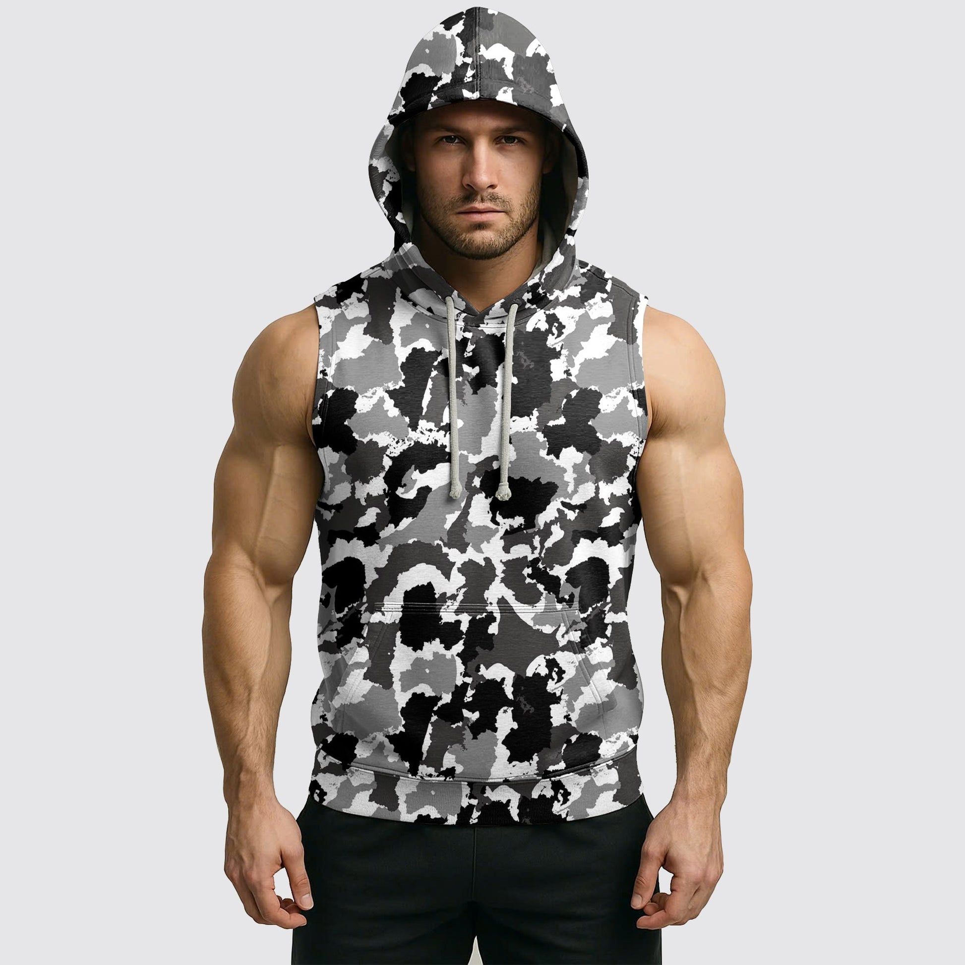 This Men's Camo Sleeveless Hoodie is made for movement—whether you're lifting heavy at the gym or hitting the streets in style. Featuring a bold camouflage print, sleeveless cut for full arm mobility, and a lightweight hood for that extra edge. Perfect for training, layering, or making a statement.