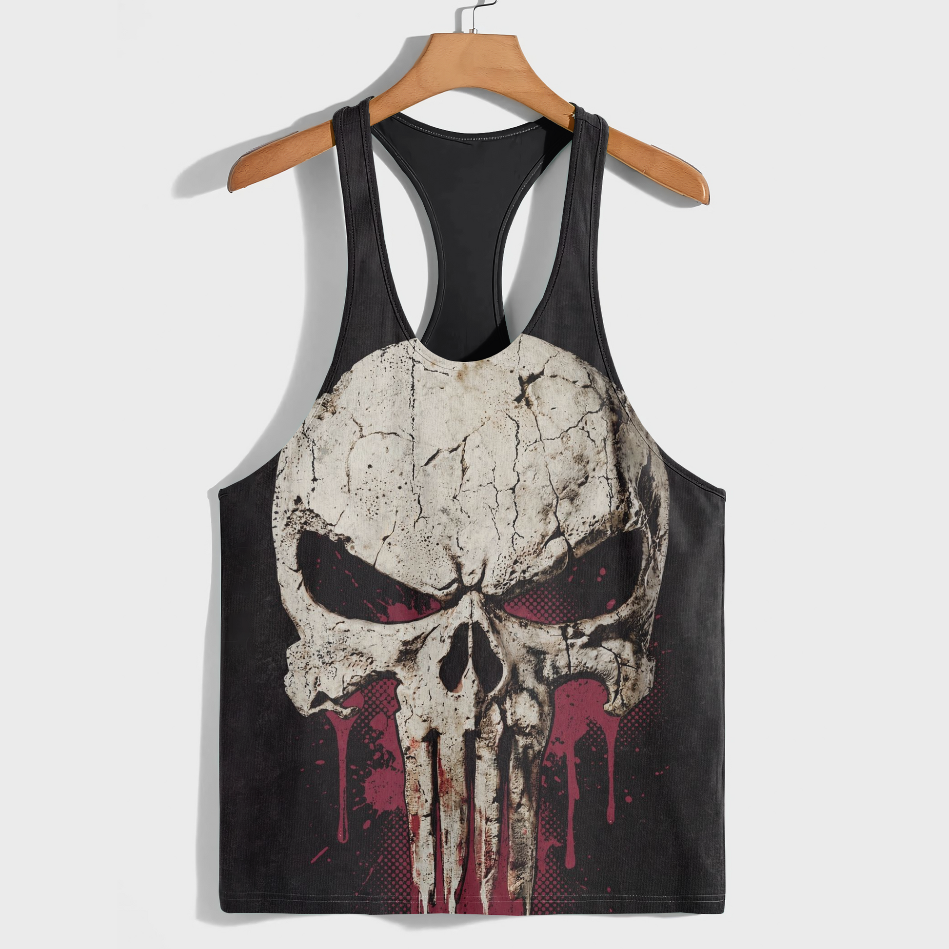 Turn heads with the Skull 3D Racerback Tank Top, featuring a bold skull graphic on a striking red backdrop.